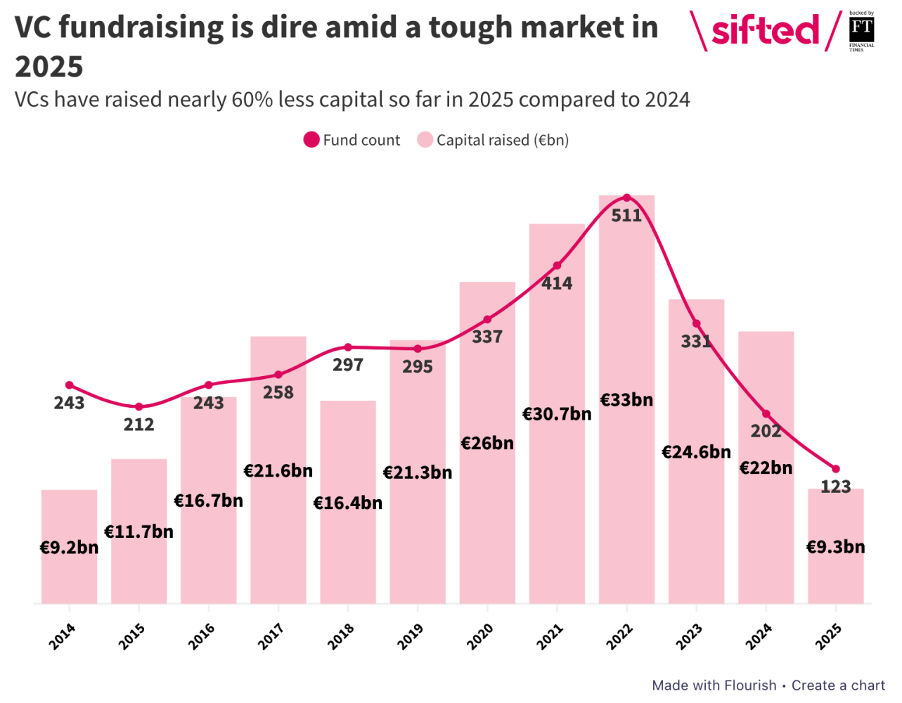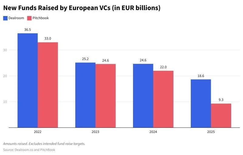 Source: Sifted - European VCs have raised nearly 60% less funding in 2025 (sifted.eu/articles/european-vc-fundraising-2025-down)