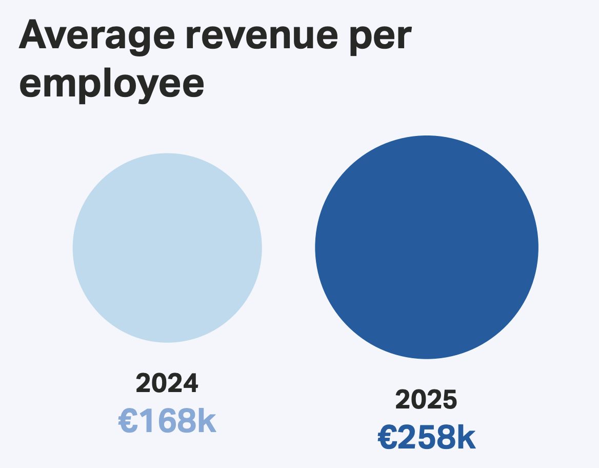 Among Europe’s fastest-growing startups, the latest Sifted 250 data shows average headcount edging down from 102 to 98, even as Average Revenue Per Employee (ARPE) climbed from €168,000 to €258,000 - an increase of roughly 54%. Funding per company rose at the same time, for the select few who could raise. And while this shift in the Sifted250 ARPE is due to changes in the companies industries and stage, ie not to be taken as an industry-wide benchmark, it does show a clear direction of travel: the fastest growers focus on output per head, not headcount per se.