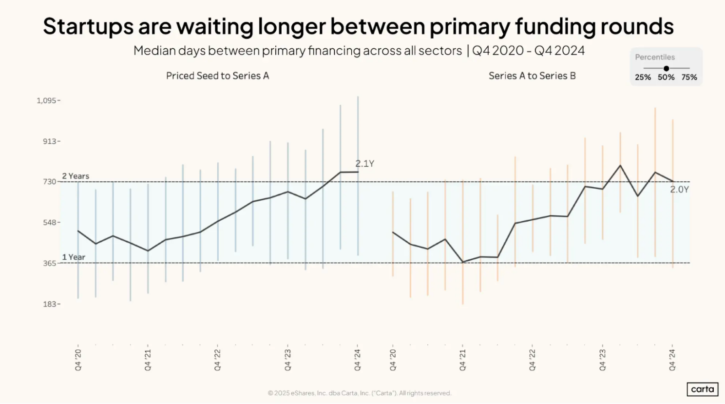 Towards 2021, the time between raises was shortening to nearly 1 year - however this has incrementally increased since the valuation crash of 2021.