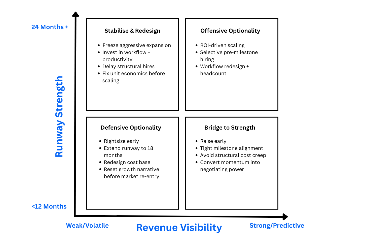 The matrix below is not a prescription. It is a capital lens. It helps founders and CFOs position themselves honestly - and decide whether they should lean forward, stabilise, or protect.