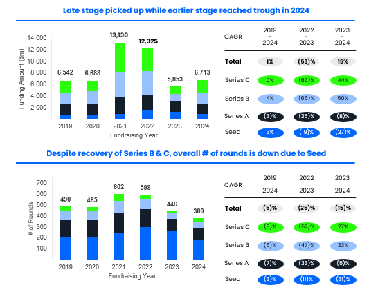 Early-stage slump: Seed declined in both number of rounds and funding amount - (31)% and (27)% respectively - reaching the trough in 2024 when later stages have rebounded. This strong decline in Seed rounds signals potential impact on Series A deal pipelines in 2025/2026.