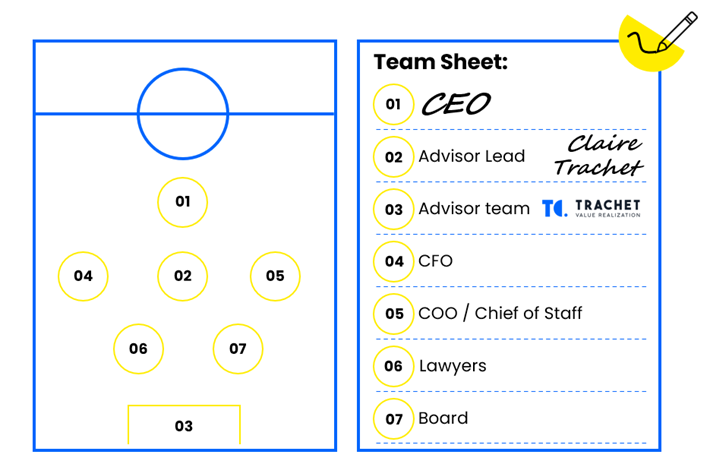 04. & 05. The Wings: Operations (CFO/COO) Your closest operational leaders are the wings - vital to the business but staying just wide enough to maintain focus both on this ongoing transaction and critically on making the business keep performing as best as it can. They contribute strategically to the transaction, relying on the midfield to transform business fundamentals into real opportunities. Their role is to remain sharp and conserve energy to play their part when critical in the deal while focusing on the business.