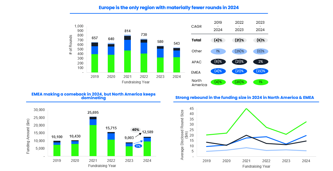 The number of Series C in EMEA remained stable in 2024 v. 2023 at 23 v. 22 transactions respectively. However, Europe saw a strong improvement in deal count (doubling from 3 to 6), even overtaking North America in Q4 - albeit with smaller deal sizes.