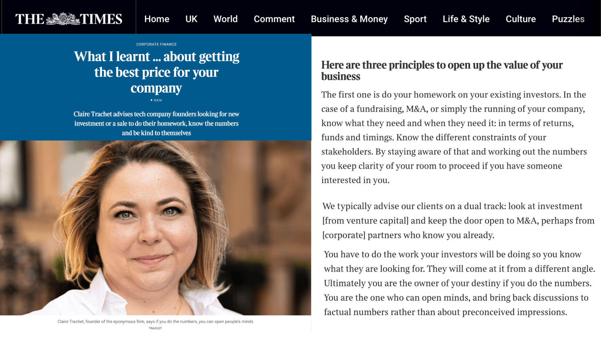 The Times related Claire's key advice to Tech founders looking for new investment or a sale: (i) do your homework, (ii) know your numbers and (iii) be kind to yourselves.